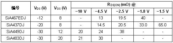 對于電源管理中的負(fù)載和電池開關(guān),以及智能手機、平板電腦、移動計算設(shè)備、硬盤驅(qū)動器和固態(tài)驅(qū)動的同步降壓轉(zhuǎn)換應(yīng)用里的控制開關(guān),-12 V SiA467EDJ提供了13m?(-4.5V)的極低導(dǎo)通電阻。-20V SiA437DJ的導(dǎo)通電阻為14.5m?(-4.5V),-30V SiA449DJ和SiA483DJ的導(dǎo)通電阻分別只有20m?(-10V)和21m?(-10V)。另外,SiA437DJ和SiA467EDJ的電流等級高達30A,承受很大的涌入電流,可用于負(fù)載開關(guān)。