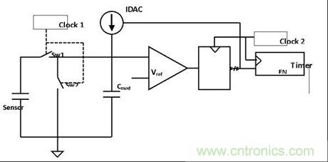 通過在GND和VREF(內(nèi)部生成)之間切換傳感器,只要在器件規(guī)定的工作范圍內(nèi),電源的任何變化都不會(huì)造成假觸發(fā)。圖2顯示了傳感器電容在集成電容(Cmod)電壓和GND之間用兩個(gè)非重疊時(shí)鐘Sw1和Sw2切換時(shí)的技術(shù)實(shí)施情況。電路比較器的輸出通過觸發(fā)器作為定時(shí)器的使能信號(hào),并通過調(diào)節(jié)電源來確保Cmod電壓與參考電壓(Vref)相同。由于輸入端上的任何信號(hào)都就n個(gè)時(shí)鐘周期求積分(n取決于分辨率),因此耦合到輸入端上的任何高頻噪聲都會(huì)通過積分效果被平均。