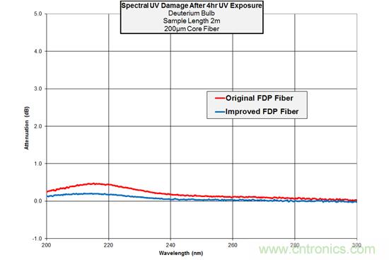 對(duì)于深紫外線領(lǐng)域應(yīng)用,高水平紫外線輻射的影響會(huì)引起光纖傳輸退化,光纖傳輸通常在數(shù)小時(shí)后發(fā)生損耗。