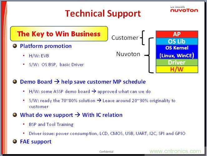 這個(gè)是我們目前的所謂的開(kāi)發(fā)的門檻,其實(shí)以新唐的MCP來(lái)講,我們做的比較簡(jiǎn)單,我們的整個(gè)系列都有提供,新唐側(cè)重于在驅(qū)動(dòng)方面。另外我們公司在深圳科技園也有定期的培訓(xùn)課程。在深圳的本地,我們也有技術(shù)支持。
