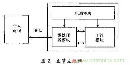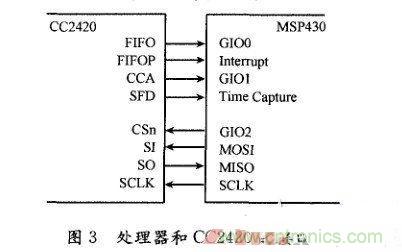 主 控節(jié)點(diǎn)結(jié)構(gòu)如圖2所示。它通過(guò)串口與PC主機(jī)交互數(shù)據(jù),通過(guò)無(wú)線模塊與艙內(nèi)子節(jié)點(diǎn)通信,同時(shí)管理和協(xié)調(diào)艙內(nèi)各節(jié)點(diǎn)的工作時(shí)序和同步。其中,微處理器用TI 公司超低功耗的MSP430F149,無(wú)線通信模塊選用Chipcon公司的2.4GHz頻段射頻低功耗接口芯片CC2420,電源模塊采用DC/DC電 源變換模式。MSP430微控制器在16bitRISC核的基礎(chǔ)上集成了RAM和閃存,同時(shí)集成了8路A/D轉(zhuǎn)換模塊、傳輸速度可編程的串口模塊和一個(gè)靈 活的時(shí)鐘子系統(tǒng),支持多種低功耗操作模式。CC2420芯片與IEEE802.15.4協(xié)議兼容,最大數(shù)據(jù)數(shù)率250Kbit/s,可編程控制輸出功率, 并支持錯(cuò)誤校正和加密。MSP430可通過(guò)SPI接口和中斷數(shù)字I/O線對(duì)CC2420進(jìn)行控制,如圖3所示。