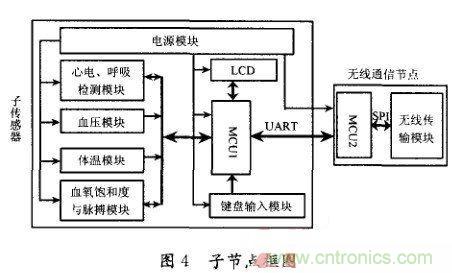 傳 感器子節(jié)點(diǎn)的組成框圖如圖4所示,包含電源模塊、心電與呼吸監(jiān)測(cè)模塊、血壓監(jiān)測(cè)模塊、血氧飽和度與脈搏監(jiān)測(cè)模塊、體溫監(jiān)測(cè)模塊、無(wú)線傳輸節(jié)點(diǎn)、微處理器模 塊、輸入與LCD顯示模塊等8個(gè)子模塊,主要執(zhí)行生命體征參數(shù)的采集、放大、濾波和無(wú)線傳輸,無(wú)線傳輸前,子節(jié)點(diǎn)也進(jìn)行實(shí)時(shí)分析、特征提取等信號(hào)預(yù)處理。