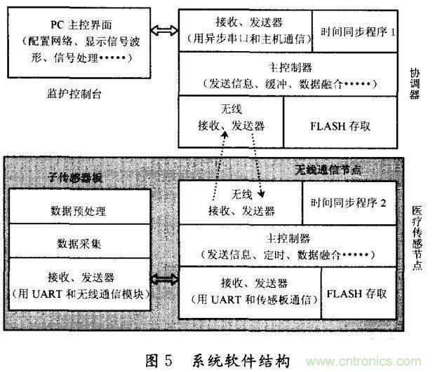 基于Zigbee星型網(wǎng)絡(luò)無(wú)線通信協(xié)議IEEE802.15.4,可穿戴式醫(yī)療監(jiān)護(hù)設(shè)備的軟件系統(tǒng)主要具備控制程序、通信軟件和用戶界面等三大功能,具體分布在PC控制主機(jī)程序、網(wǎng)絡(luò)協(xié)調(diào)器軟件和傳感子節(jié)點(diǎn)軟件中,如圖5所示。