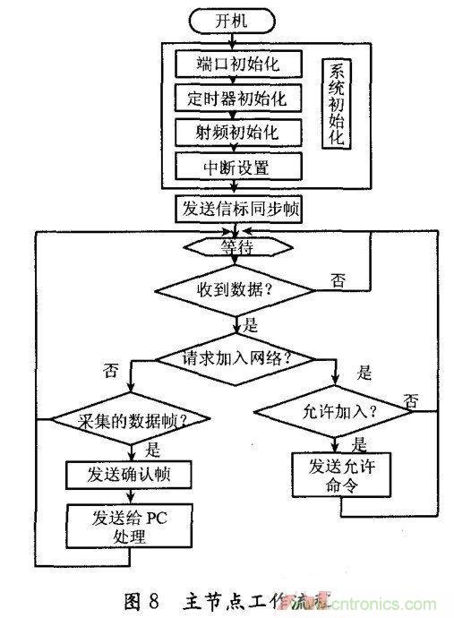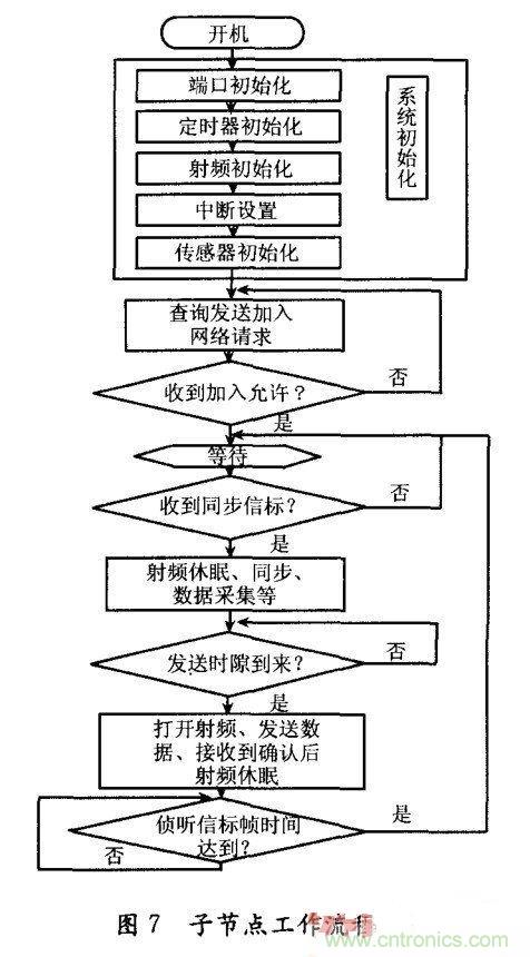 傳 感節(jié)點(diǎn)軟件和傳感器協(xié)調(diào)器軟件的程序流程分別如圖7和圖8所示。本流程在IEEE802.15.4協(xié)議基礎(chǔ)上,結(jié)合TDMA技術(shù)和無(wú)線傳感器網(wǎng)絡(luò)S- MAC協(xié)議思想而設(shè)計(jì)。從圖7可以看出,為了節(jié)省傳感節(jié)點(diǎn)的能耗,除加人網(wǎng)絡(luò)請(qǐng)求、發(fā)送數(shù)據(jù)和偵聽(tīng)同步信標(biāo)幀時(shí)段外,傳感節(jié)點(diǎn)均處于休眠狀態(tài)。