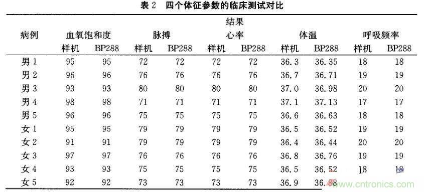 本 可穿戴生命體征監(jiān)護(hù)設(shè)備樣機(jī)已研制完成。采用本樣機(jī)對(duì)高壓氧艙中的10例病例(男5例,女5例,年齡22~71歲,平均年齡46.2歲)在2.0ATA艙 壓下進(jìn)行臨床測(cè)試(終端機(jī)與主機(jī)距離為10米),并與日本COLINBP288監(jiān)護(hù)儀檢測(cè)結(jié)果進(jìn)行對(duì)照。表2顯示的血氧飽和度、脈搏、心率、體溫、呼吸頻 率等參數(shù)的對(duì)比檢測(cè)數(shù)據(jù)的一致很好。