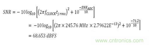 現(xiàn)在,通過計算得到了所有必須的要素,但依然缺少最后一個公式。 需要計算此抖動對AD9643的SNR產生的影響。 現(xiàn)在來看看這個公式是什么,然后代入已知數。已知時鐘頻率和rms抖動。 從AD9643數據手冊中可以得到140 MHz模擬輸入頻率下的SNR等于71.4 dBFS。 使用公式,可以看到結果為: