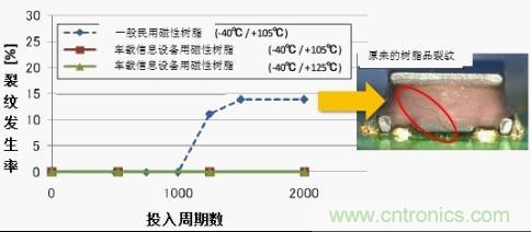 熱沖擊試驗(yàn)投入的循環(huán)數(shù)和開裂發(fā)生率的關(guān)系如圖3所示??梢缘弥c面向一般民用市場(chǎng)的磁性樹脂在1000次循環(huán)試驗(yàn)以內(nèi)會(huì)發(fā)生開裂相比,我們開發(fā)出的用于車載信息設(shè)備的磁性樹脂在2000次循環(huán)之后仍未發(fā)生開裂現(xiàn)象。并且,已經(jīng)確認(rèn)在更為嚴(yán)酷的環(huán)境下---40℃↔+125℃中進(jìn)行的熱沖擊試驗(yàn)也沒有發(fā)生開裂現(xiàn)象。