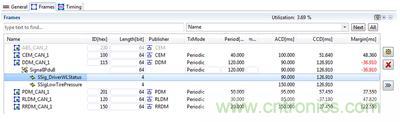 在模擬 CAN 總線數(shù)據(jù)路徑時(shí),需要考慮到傳輸開始時(shí)的不確定性??赡艹霈F(xiàn)的情況是,更高優(yōu)先級(jí)的信息占用數(shù)據(jù)總線,從而造成傳輸延遲。因此要找出造成延遲變化的抖動(dòng)因素 -- 通常要提前知道有多少優(yōu)先級(jí)較高的信號(hào)可能在總線上,這樣可以盡可能精確預(yù)測(cè)抖動(dòng)因素。通過這些參數(shù)和進(jìn)行自動(dòng)化設(shè)計(jì)規(guī)則檢查 (DRC),從第(3)步到第(7)步的最大延遲為74.5毫秒,這樣的設(shè)計(jì)檢查可以通過。這是“最壞情況”的測(cè)試,設(shè)計(jì)人員要相信路徑延遲永遠(yuǎn)不會(huì)比這更糟,實(shí)際上會(huì)好很多。