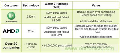 事實證明,單元識別 ATPG 測試法是唯一可以發(fā)現傳統方法檢測不出的缺陷的方法。它可以發(fā)現一套完整的針對固定故障、節(jié)點跳變和時延缺陷的測試方法發(fā)現不了的缺陷,因為這種方法首先就對標準單元進行物理布局時可能出現的實際缺陷進行模擬。在新技術的改進下,單元識別測試法中的測試向量大小得以縮小,但整個測試向量仍大于傳統的測試方法產生的測試向量,因此要進行嵌入式壓縮。許多公司因為采用單元識別測試法而收效顯著。部分成效的概述請見圖1。