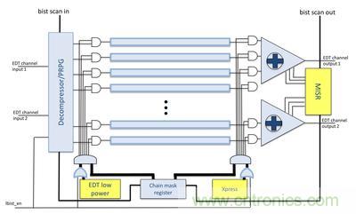 越來越多的客戶在設計相同的電路時同時采用嵌入式壓縮和 LBIST 測試法。由于這兩種技術能夠以類似的方式運用掃描鏈,因此可以將兩者整合成可共享的統一邏輯,從而幫助客戶更有效地運用這種方法。綜合測試邏輯架構請見圖2。