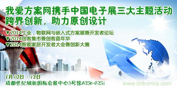 【導讀】我愛方案網(wǎng)和CNT Networks攜手中國電子展主辦的“2014工業(yè)、物聯(lián)網(wǎng)和嵌入式設計方案展暨中國西部電子開發(fā)者與創(chuàng)客論壇”即將于2014年7月10日-12日在成都開幕。同期同地,我愛方案網(wǎng)還將舉辦2014創(chuàng)客集市暨創(chuàng)客嘉年華活動,以及與千家網(wǎng)合辦2014智能家居開發(fā)者論壇暨創(chuàng)新大賽(成都)。