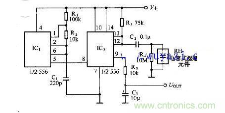 高分子電容型濕敏元件的應(yīng)用電路如圖所示。它由兩個(gè)時(shí)基電路IC1、IC2組成。IC1及外圍元件組成多諧振蕩器,主要產(chǎn)生觸發(fā)IC2的脈沖。ICz和電容型濕敏元件及外圍元件組成可調(diào)寬的脈沖發(fā)生器,其脈沖寬度將取決于濕敏元件的電容值的大小。調(diào)寬脈沖從IC2的9腳輸出,經(jīng)R5、C3濾波后成為直流信號輸出。它正比于空氣的相對濕度,其靈敏度為2mv/%RH。