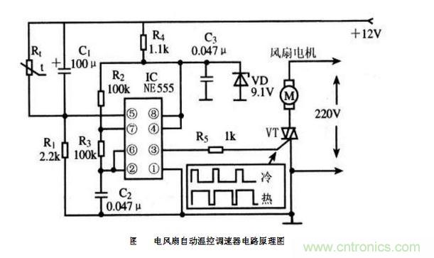 電路工作原理:圖中IC是555時基電路,與R2、R3和C2等元件構(gòu)成多諧振蕩器,可發(fā)出占空比可調(diào)的矩形波信號。當溫度變化時,熱敏電阻的阻值發(fā)生變化,改變多諧振蕩器輸出方波的占空比,調(diào)節(jié)雙向晶閘管VT的導(dǎo)通角,從而改變風(fēng)扇電極兩端的電壓,自動調(diào)節(jié)電風(fēng)扇的轉(zhuǎn)速。元器件選擇 集成電路IC選用NE555時基電路,也可使用LM555和TLC555等型號。VT為雙向晶閘管,其耐壓應(yīng)在400V以上,額定電流應(yīng)根據(jù)所控制的電風(fēng)扇容量來合理選用。電阻R1~R5可選用普通1/8或1/4W碳膜電阻器;Rt為負溫度系數(shù)熱敏電阻,可選常溫下阻值為10KΩ左右的熱敏電阻。電容C1選用普通鋁電解電容器;電容C2和C3選用滌綸電容器。VD為穩(wěn)壓值為9.1V的穩(wěn)壓二極管。
