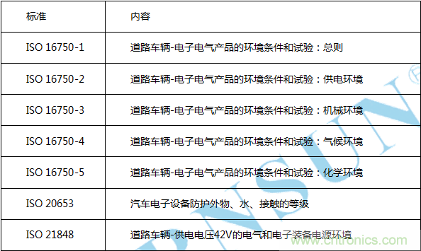 ISO 16750 系列標(biāo)準(zhǔn)是國(guó)際標(biāo)準(zhǔn)化組織ISO 最近幾年推出的針對(duì)汽車(chē)電子的環(huán)境可靠性標(biāo)準(zhǔn),該標(biāo)準(zhǔn)是歐系車(chē)常用的標(biāo)準(zhǔn),并且逐漸被世界各國(guó)轉(zhuǎn)化為國(guó)家標(biāo)準(zhǔn),也逐漸被各企業(yè)標(biāo)準(zhǔn)所引用,成為應(yīng)用比較廣泛的汽車(chē)電子的環(huán)境可靠性標(biāo)準(zhǔn)。該系列標(biāo)準(zhǔn)包括五個(gè)部分: