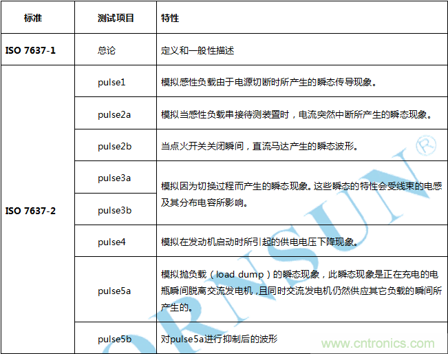 針對(duì)汽車(chē)電子自身產(chǎn)生的干擾,國(guó)際無(wú)線(xiàn)電干擾委員會(huì)(CISPR)對(duì)汽車(chē)電子業(yè)提出了嚴(yán)格的要求,尤其是車(chē)載收音機(jī)、數(shù)字電視、導(dǎo)航設(shè)備都是這種干擾的重災(zāi)區(qū)。所以 CISPR25:用于保護(hù)車(chē)載接收機(jī)的無(wú)線(xiàn)電騷擾特性的限值和測(cè)試方法,對(duì)汽車(chē)電子自身的發(fā)射狀態(tài)也有了明確的等級(jí)判定。EMS方面的測(cè)試項(xiàng)目如下所示:
