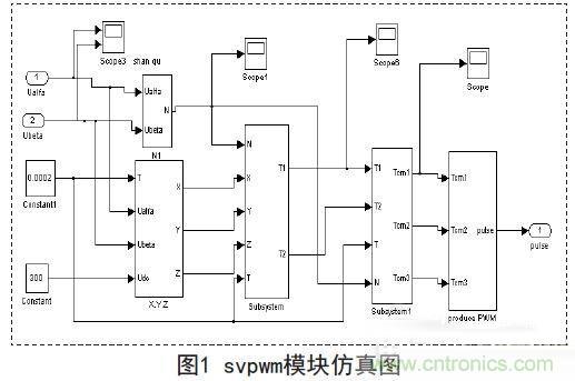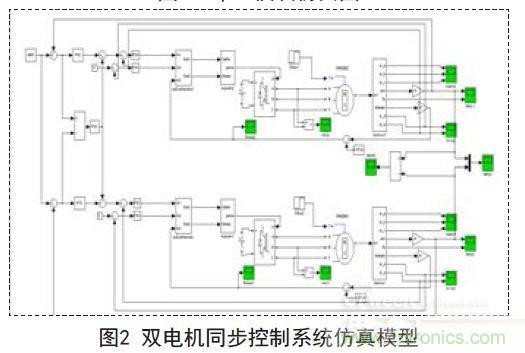 PlD控制有很強的生命力,它對于大多數過程都具有良好的控制效果和魯棒性,而且算法原理簡明,參數物理意義明確,理論分析體系完整且應用經驗豐富。因此針對系統中的抑制干擾特性這一方面的要求可以采用PID控制器。對單電機的控制采用雙閉環(huán)設計,通過svpwm進行調速,使系統具有良好的穩(wěn)定性,svpwm調速模塊仿真圖如圖1所示。然后將兩臺電機反饋回來的轉速差作差,再通過PID調節(jié)作為當負載有變化時的轉速反饋額外補償。系統仿真模型如圖2所示。