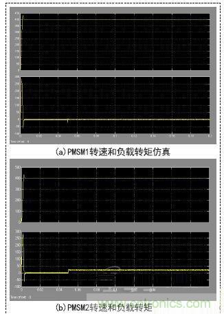 PMSM1轉速受到PMSM2負載改變的影響,出現微小的下降,然后快速恢復穩(wěn)定,轉矩也出現微小的波動后迅速恢復穩(wěn)定。說明基于svpwm調速的PID雙閉環(huán)控制系統有較強的魯棒性,雙電機間偏差耦合補償策略當某一電機負載改變時,另一個電機有良好的跟隨性能。