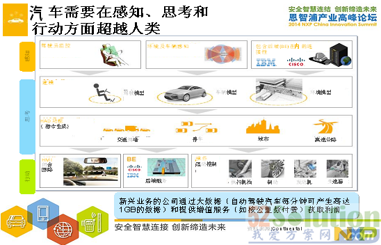 Owen展現(xiàn)智能汽車安全互聯(lián)的美好場景。一個安全互聯(lián)的智能汽車就是未來。車有自己的感知系統(tǒng),在思考和行動方面都超越了人類,它會自動地去決定該行駛的速度,在感知到前面有個物體的時候它會自動停車,或者當(dāng)車感知到前面有交通擁堵的狀況發(fā)生,它會自然而然的慢下速度,而且會保持一個安全距離。在智能汽車的世界里,更多的是采用電子的系統(tǒng),也意味著發(fā)動機(jī)的效率也會更加提高。