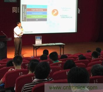 圖2:e絡(luò)盟與重要技術(shù)合作伙伴飛思卡爾、松下、TE Connectivity及是德科技開展的大學(xué)路演活動現(xiàn)場之一
