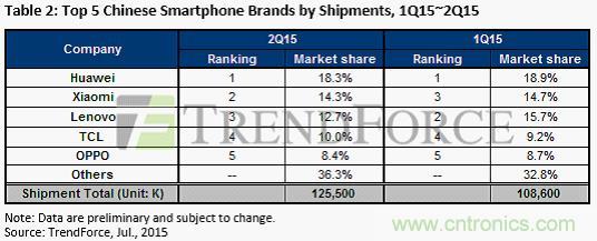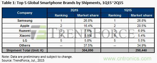 【導(dǎo)讀】近日,市場(chǎng)研究機(jī)構(gòu)TrendForce發(fā)布2015年度第二季度全球智能手機(jī)報(bào)告。中國(guó)的華為明顯獨(dú)領(lǐng)風(fēng)騷。數(shù)據(jù)顯示,三星雖然從蘋果手里奪回第一的寶座,但是,Q1和Q2 幾乎毫無(wú)變化。蘋果的市場(chǎng)份額則一調(diào)再掉,從Q1的20.5%掉到Q2的15.4%。華為的市場(chǎng)份額增加了7%,小米的份額增加了5%。