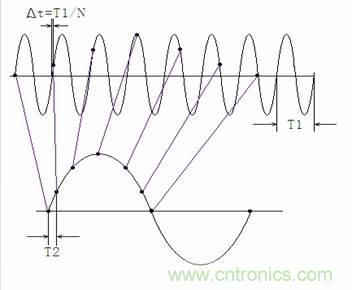 可以看到,等效采樣方法在輸入信號一個周期內(nèi)僅采樣一個點且每個周期采樣的相位有遞增關(guān)系(圖1中△t),調(diào)整這個遞增相位可以達(dá)到調(diào)整相位分辨率的目的。