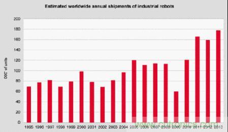 此外,IFR還預(yù)估2014年全球機(jī)器人安裝至少可成長至20萬臺,主要增長地區(qū)在亞洲,尤其是中國、韓國和東南亞市場以及北美;同時(shí)由工業(yè)4.0 潮流帶動,促使機(jī)器人在工業(yè)自動化擔(dān)綱要角,估計(jì)2015年至2017年,機(jī)器人安裝數(shù)量增長至288,000臺,復(fù)合年均增長率(CAGR)達(dá)12%。中國政府近期有意加大力度注入大量的資金開發(fā)機(jī)器人,未來中國機(jī)器人產(chǎn)業(yè)可望快速成長。