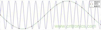 簡單溫習(xí)奈奎斯特采樣定理:如果信號(hào)是帶限的,且采樣頻率Fs高于信號(hào)最高頻率Fmax的兩倍,采樣樣本中完整地保留了原始信號(hào)中的信息。而高于或等于采樣頻率的一半頻率分量,則會(huì)導(dǎo)致混疊現(xiàn)象,如圖 5所示由于采樣頻率過小,每個(gè)信號(hào)周期樣本數(shù)量太少,重建后的波形頻率分量落到低于采樣頻率的頻率范圍中,與原始信號(hào)大相徑庭。