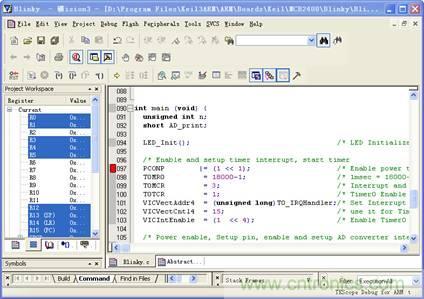 在程序窗口(包括C語(yǔ)言、匯編和反匯編窗口)中, 用鼠標(biāo)雙擊需要設(shè)置斷點(diǎn)的程序行,則在窗口左邊的狀態(tài)條中出現(xiàn)紅色的斷點(diǎn)標(biāo)志如圖2所示,完成設(shè)置斷點(diǎn)操作。再次用鼠標(biāo)雙擊該程序行,窗口左邊的紅色斷點(diǎn)標(biāo)志消失,則為刪除斷點(diǎn)操作。