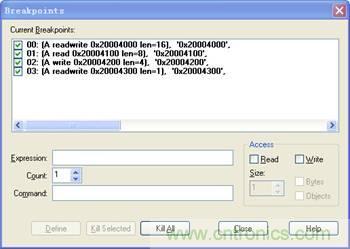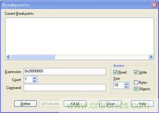 具體定義方法:在Expression內(nèi)輸入變量的地址,然后選擇讀寫屬性,并正確設(shè)置字節(jié)范圍,最后點(diǎn)擊Define即可。例如,在地址0x20004000開(kāi)始,16字節(jié)范圍內(nèi),定義讀寫斷點(diǎn)操作,具體設(shè)置方法如圖4所示。