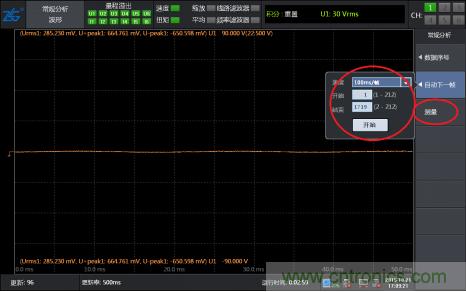 第三步,點(diǎn)擊圖 3菜單中“測(cè)量”區(qū)域,使界面出現(xiàn)“測(cè)量”字樣,此時(shí)儀器界面中的波形會(huì)停止刷新。然后通過“自動(dòng)下一幀”菜單,選擇要查看的波形幀數(shù),可以選擇從第一幀開始,到最后一幀介紹,然后設(shè)定每一幀的回放速度(從人眼的反應(yīng)考慮,建議選擇200ms/幀以上),點(diǎn)擊開始之后,界面中的波形會(huì)進(jìn)行回放,當(dāng)看到想要看的波形后按停止按鍵,然后通過“數(shù)據(jù)序號(hào)”來(lái)調(diào)整波形,確??吹阶约合胍牟ㄐ?,如圖 4所示;
