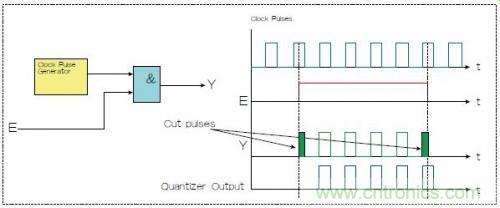 圖1:兩種選通脈沖串的方法,一種是使用選通信號E和與門(Y輸出),一種是量化器(藍(lán)色)。