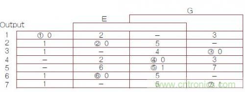 圖2:異步有限狀態(tài)機(jī)(FSM)轉(zhuǎn)換主表,其中1,2,3,4,5,6,7帶圈的數(shù)字是穩(wěn)定FSM狀態(tài)號(G是時鐘輸入)。