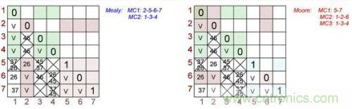 圖3:根據(jù)Mealy(左)和Moore(右)狀態(tài)機(jī)做出的最終表格對。