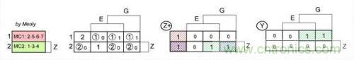 現(xiàn)在就很容易畫出壓縮的狀態(tài)轉(zhuǎn)換表,并為Z編碼的內(nèi)存單元和輸出選通信號Y畫出卡諾-維奇圖(圖4)。