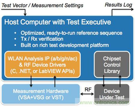 典型的非信令WLAN測試系統(tǒng)通過一個主機進行控制,主機運行的測試執(zhí)行程序可讀取文件的測試矢量和測量設(shè)置、運行所需的測試,并將結(jié)果寫入日志文件或數(shù)據(jù)庫。測試執(zhí)行程序調(diào)用應(yīng)用程序編程接口(API)來控制測試儀器,這些測試儀器通常包括一個或多個矢量信號分析儀、矢量信號發(fā)生器或者矢量信號收發(fā)儀。此外,測試執(zhí)行程序還通過調(diào)用WLAN測量算法來對所采集的數(shù)據(jù)進行測量。