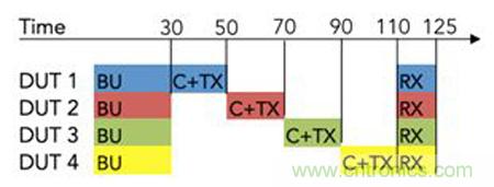 利用多線程并行軟件架構(gòu)和外部開關(guān)電路,已經(jīng)完成啟動的DUT在執(zhí)行TX和RX測試時,并行軟件線程可控驅(qū)動下一個DUT的啟動過程,從而實現(xiàn)測試的流水線執(zhí)行。這種方法減少了儀器的停機時間,縮短了高達35%的測試時間,如圖4所示。