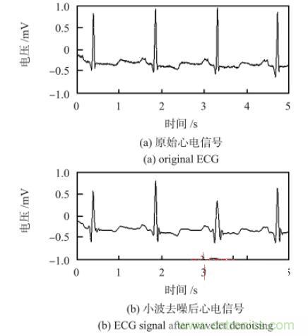 采用小波分析的方法進(jìn)行心電信號(hào)去噪。小波分析由于能同時(shí)在時(shí)域和頻域中對(duì)信號(hào)進(jìn)行分析,具有多分辨分析的功能,所以,在不同的分解層上有效地區(qū)分信號(hào)的突變部分和噪聲。對(duì)含有噪聲的原始心電信號(hào)進(jìn)行小波分解后,噪聲部分主要集中在高頻小波系數(shù)中,包含有用信號(hào)的小波系數(shù)幅值較大,但數(shù)目少;而噪聲對(duì)應(yīng)的小波系數(shù)幅值小,數(shù)目較多?;谏鲜鎏攸c(diǎn),選取無偏似然估計(jì)閾值對(duì)小波系數(shù)進(jìn)行處理,然后對(duì)信號(hào)重構(gòu)即可達(dá)到消噪的目的。圖7 為心電信號(hào)小波去噪前后對(duì)比,信噪比可以達(dá)到121 dB。
