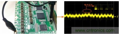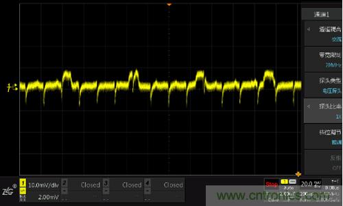 從圖中可以看出,所測(cè)的波形夾雜著許多的噪聲和雜波,直流、交流波形混在一起,沒(méi)辦法清晰的觀察紋波,導(dǎo)致無(wú)法準(zhǔn)確的測(cè)量紋波的值。很多工程師測(cè)量紋波出現(xiàn)這種情況是因?yàn)闆](méi)有掌握正確的紋波測(cè)量方法。