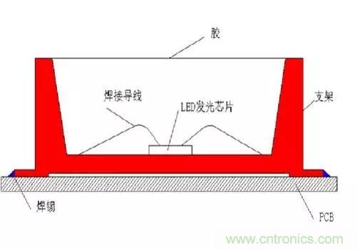 眾所周知,回流焊爐內(nèi)一般會有240°的高溫。如果環(huán)氧樹脂膠TG點過低,或封裝過程有潮氣吸入,高溫會導致膠體非線性急劇膨脹,導致LED芯片焊線拉斷破壞失效。另外高溫會通過支架管腳將熱量快速傳導到芯片,造成芯片體龜裂碎化失效的可能性增加。而這種問題是最可怕的,一般在工廠老化測試時也不會出現(xiàn)問題,經(jīng)過運輸?shù)娇蛻舳嗽偈褂靡欢螘r間問題就會逐步暴露出來。