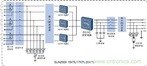 光伏逆變器由升壓回路和逆變橋式回路構成,升壓回路主要用于將直流電壓升壓至逆變器輸出所需直流電壓,逆變橋式回路主要用于將升壓后的直流電壓轉換為固定頻率的交流電壓。因此,經升壓回路和逆變橋式回路完成將直流電轉換為交流點的功能。