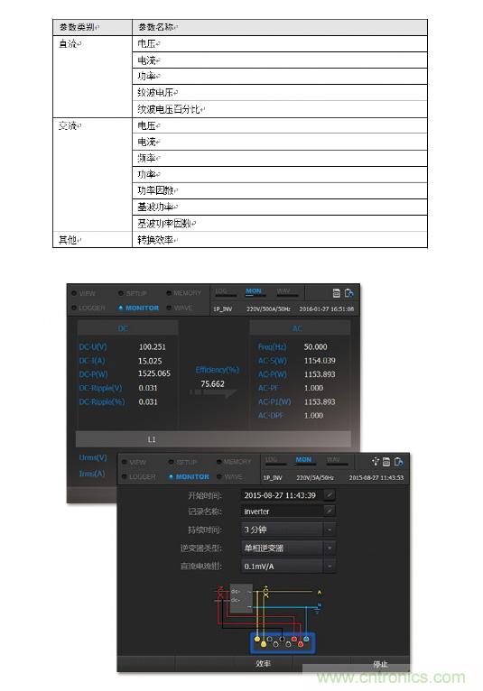 E6500電能質量和能效分析儀可以快速測量逆變器轉換效率以及功率。目前支持單向逆變器與三相逆變器測量,主要測試功能如下: