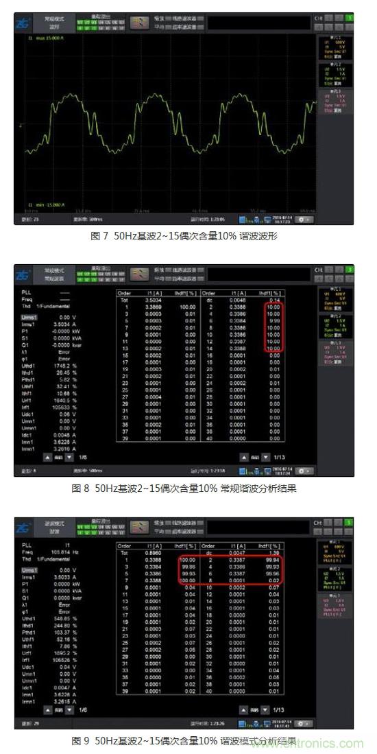 如圖 7所示只包含50Hz基波的2~15次的偶次諧波的波形,受偶次諧波的影響,每個基波周期多了兩次過零,而且頻率與基波相近,PLL的濾波器亦無法濾除該諧波,因此PLL結果錯誤,導致諧波分析結果也完全錯誤,此時的常規(guī)諧波分析結果仍然正確,而且保持了很高的精度。說明常規(guī)諧波可以不受偶次諧波影響,在采樣率和FFT點數(shù)足夠時,具有受被測信號影響低的優(yōu)勢。