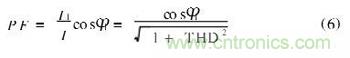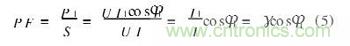 2) 若系統(tǒng)輸入電壓為標準的正弦波,僅有基波分量,即有效值電壓為基波電壓,輸入電流是非正弦信號,即包含基波分量,又含有其它高次諧波。電流基波分量的有效值可視為基波分量的有功分量和無功分量的正交合成φ1為輸入電壓與輸入電流基波之間的相位角。故P = UI1cosφ1,代入式(4)得