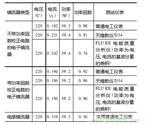 筆者用不同的儀器對不同品牌40W電子鎮(zhèn)流器啟動的熒光燈和電感鎮(zhèn)流器啟動的熒光燈做了實驗,其測得的數(shù)據(jù)如下表: