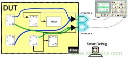 -現(xiàn)場探頭:允許采用兩個專用探頭,經(jīng)配置用于觀察邏輯元件中任何輸入或輸出的探測點(圖1)。然后,探頭數(shù)據(jù)可發(fā)送到示波器或甚至重新引導回到FPGA結(jié)構(gòu),驅(qū)動內(nèi)部邏輯分析儀。這些探測點是實時動態(tài)的。探測點可以通過軟件在運行中更改,不需要把FPGA重新編譯或重新編程。