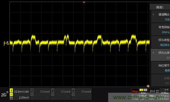 從圖5中可以看出,正確的紋波測量方式可以清晰的捕抓到正常的紋波,減少了不必要的噪聲和雜波對紋波的影響,基本上就是一條干凈的紋波了,在這樣的基礎(chǔ)上進(jìn)行電源紋波測量,可以更精確的測量紋波的值,進(jìn)而準(zhǔn)確估測電源質(zhì)量。