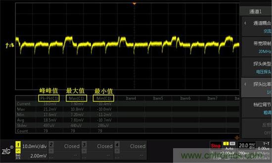 紋波測試一般以峰峰值來表示,具體可以使用【measure】進(jìn)行自動測量,如下截圖ZDS2000系列示波器,能支持51種真正意義的參數(shù)測量統(tǒng)計(jì)功能,基于全存儲深度的基礎(chǔ)上測量紋波的參數(shù),或者也可以使用“一鍵光標(biāo)”進(jìn)行手動測量,如下圖6所示。