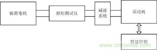 在國(guó)標(biāo)GBT/ 30549-2014里對(duì)齒槽轉(zhuǎn)矩的測(cè)試有了明確的定義:電機(jī)繞組開(kāi)路時(shí),電機(jī)回轉(zhuǎn)一周內(nèi),由電樞鐵心開(kāi)槽,有趨于最小磁阻位置的傾向而產(chǎn)生的周期性力矩。齒槽轉(zhuǎn)矩的測(cè)試方法常用的有:杠桿測(cè)量法、轉(zhuǎn)矩儀法。杠桿測(cè)量法比較簡(jiǎn)單,測(cè)量精度比較差,所以主要用于對(duì)精度要求不高的場(chǎng)合。轉(zhuǎn)矩儀法架構(gòu)圖如圖2所示,由于伺服電機(jī)的齒槽轉(zhuǎn)矩非常小,所以測(cè)試時(shí)需要以一個(gè)非常低的轉(zhuǎn)速來(lái)帶動(dòng)未上電的被測(cè)電機(jī)來(lái)完成測(cè)試,原動(dòng)機(jī)輸出后要先經(jīng)過(guò)減速系統(tǒng),將轉(zhuǎn)速降至1rpm/min左右,然后帶動(dòng)被測(cè)電機(jī)進(jìn)行測(cè)試,用扭矩