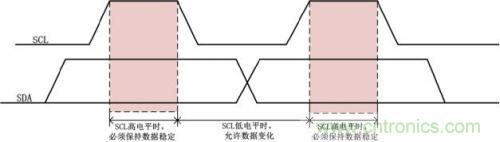 I2C總線進(jìn)行數(shù)據(jù)傳送時(shí),時(shí)鐘信號SCL為高電平期間,數(shù)據(jù)線SDA上的數(shù)據(jù)必須保持穩(wěn)定,只有在時(shí)鐘線SCL上的信號為低電平期間,數(shù)據(jù)線SDA上的高電平或低電平狀態(tài)才允許變化,如圖3所示。