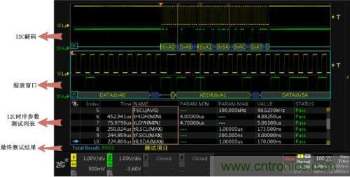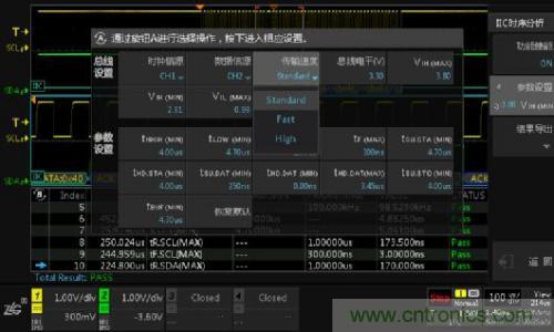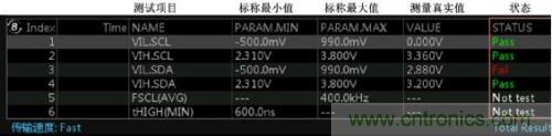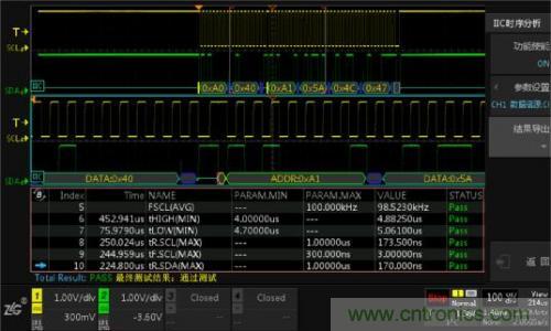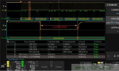 使用I2C時(shí)序分析軟件,它能夠在極短的時(shí)間內(nèi)完成總線信號的DC特性和AC特性分析,并與器件手冊標(biāo)稱參數(shù)做對比,直接輸出測試結(jié)果(Pass/Fail),同時(shí)支持報(bào)表導(dǎo)出,省去人工錄入數(shù)據(jù)的煩惱,極大的提升測試效率。具體測試界面如下圖4所示。